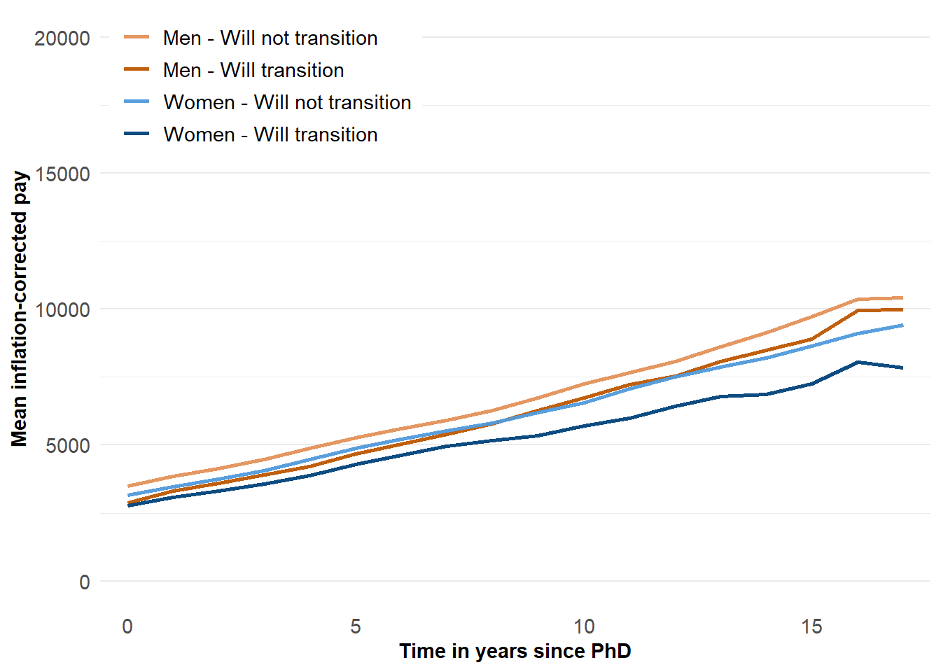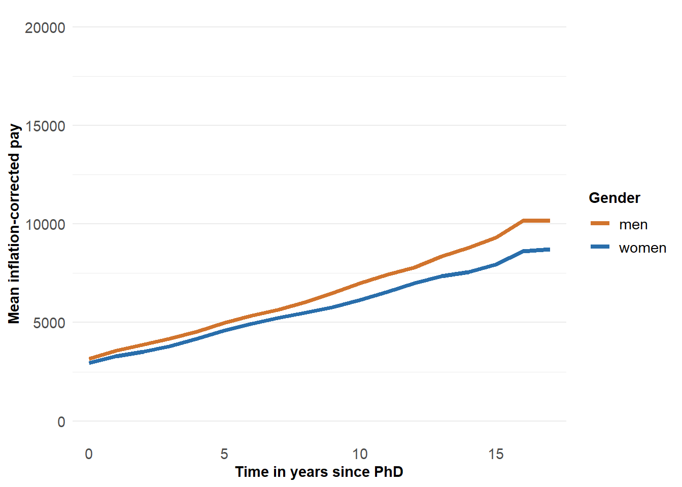 labs(y="Mean inflation-corrected pay", x="Time in years since PhD") +
