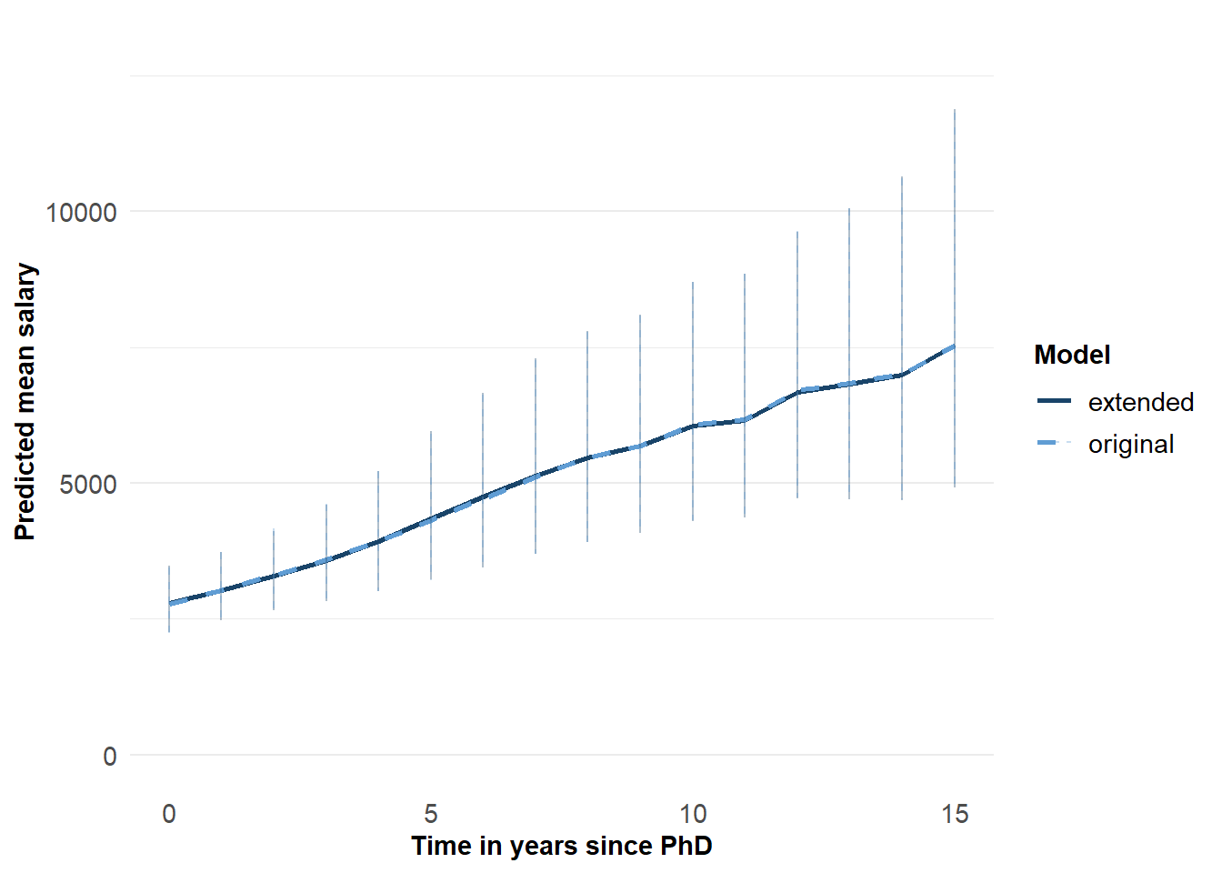 labs(x = "Time in years since PhD", y = "Predicted mean salary", color="Model", linetype="Model")+